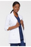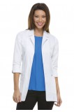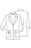 A Contemporary fit button front lab coat features a notched lapel and 3/4 length sleeves with side vents that can be folded up as cuffs. Also featured are four patch pockets (one with utility strap and D-ring), back darts and a center back belt for shaping. Center back length: 30".