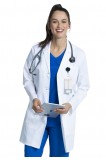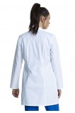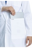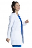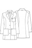 This Modern Classic fit lab coat features notched lapels, a four button front closure plus front and back princess seams for fit and shaping. There are three pockets: one chest pocket with an instrument loop and two front tablet pockets. Two back shoulder yoke seams and an elastic bungee locker loop located at the center back below the collar complete the look. Center back length: 33"