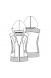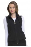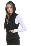 A Contemporary zip front vest features four patch pockets, knit side panels, removable hoodie, dotted-heart heat transfer and bungee instrument loops. Center back length: 25"
