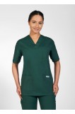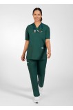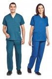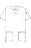 V-Neck scrub top with three front pockets and one shoulder pen pocket. Five pocket elastic drawstring pants.