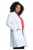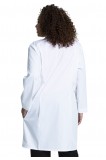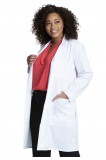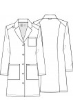 This Modern Classic fit lab coat features notched lapels and a five button front closure. Additional details include front and back yoke seams plus back princess seams. Bungee ID badge loop at the wearer's right yoke seam and elastic bungee locker loop at the center back below the collar. There are three pockets: one chest pocket and two front tablet pockets with side entry for easy access to pant pockets. Center back length: 37"
