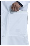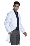 This Men's Modern fit lab coat has a five button front closure with notched lapels and a bungee ID badge loop on the right lapel. There is also a back yoke seam and center back seam with a kick pleat for freedom of movement. Elastic bungee locker loop at the center back below the collar. There are three pockets: one chest pocket and two front tablet pockets with side entry for easy access to pant pockets.