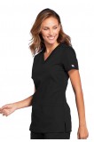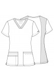 A Contemporary fit V-neck top features front patch pockets (the right with an exterior pocket and pen slot, the left with a hidden instrument loop), side vents and stretch rib-knit back panels for movement and extra comfort. Center back length: 27"