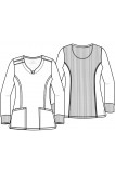 This Contemporary fit, long sleeve v-neck top has front yoke seams and a bungee ID badge loop at the right shoulder. There is rib-knit at the center front neckline inset, center back panel and sleeve cuffs. Other features include front and back princess seams with self strapping along the front seams. There are a total of three pockets: two front patch pockets and one interior cellphone pocket on the right. Side vents complete the look. Center back length: 26"