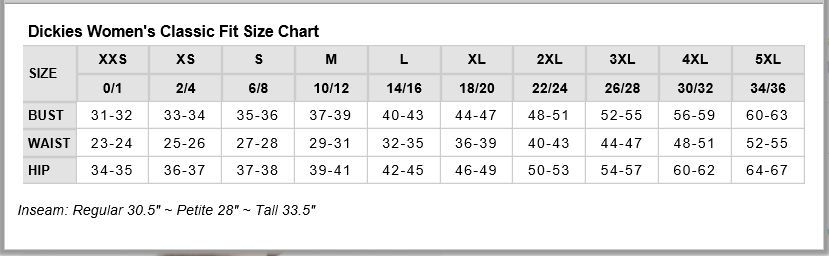 A mid-rise, moderate flare leg pant features an adjustable drawstring with elastic at the back and Dickies logo twill tape on the inside back waistband. Also featured are patch pockets, a back pocket, cargo pockets with a stretchy Red knit interior pocket (White knit pocket on White) and side vents. Inseam length: Regular- 30 1/2", Petite- 28", Tall- 331/2".